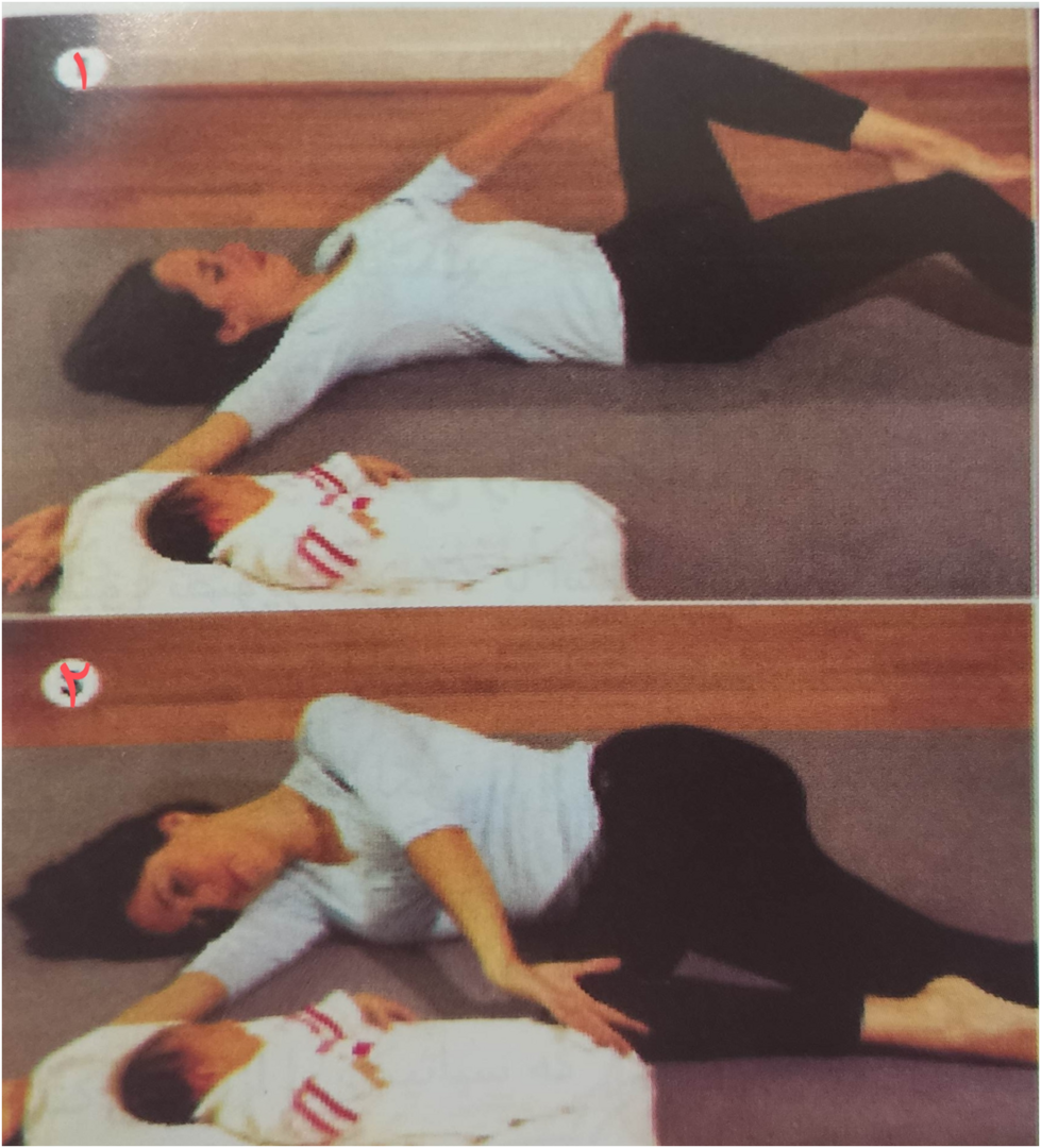 زانوها خم شده و یک زانو زاویه قائمه با شکم می سازد لگن ثابت است پشت دست را در کنار زانوی خم شده روی شکم قرار بدهید . ( کف دست بیرون باشد ) دست دیگرکشیده و آرنج خم نشود سپس چرخش انجام می شود خمیدگی و پیچشی در پشت وجود ندارد .